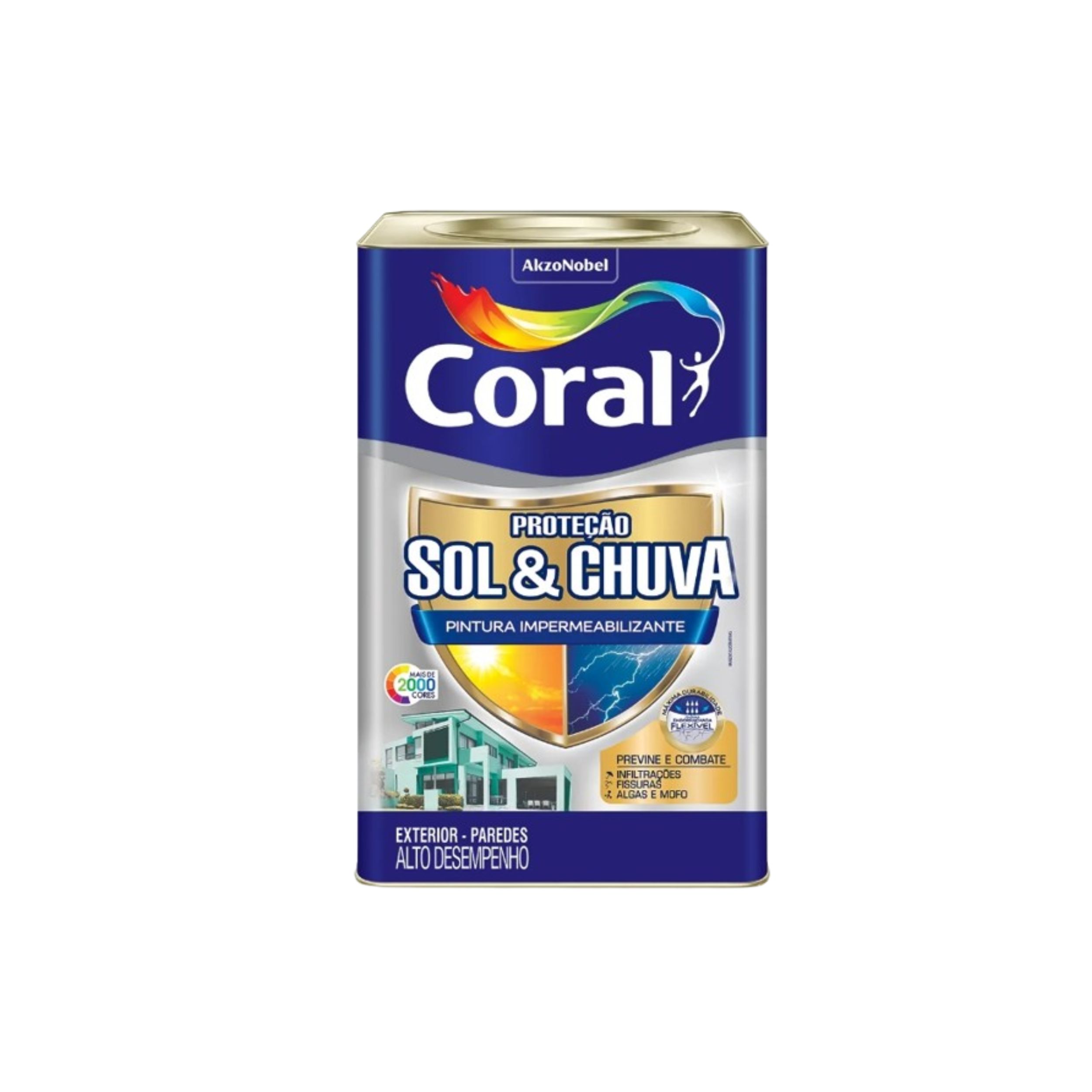 Proteção Sol & Chuva Pintura Impermeabilizante é a opção mais completa para pintar e proteger paredes externas, pois forma uma película emborrachada flexível que previne fissuras e infiltrações, combate algas & mofo, além de conferir máxima durabilidade e resistência a suas cores, que são mais resistentes. É formulado para ser aplicado diretamente em paredes novas ou reboco, pois bloqueia o aparecimento do salitre, permitindo que a pintura seja realizada quando a superfície estiver visivelmente seca, sem a necessidade de esperar o tempo de cura ou aplicar fundos Rende até 85m² acabados por embalagem de 18L.