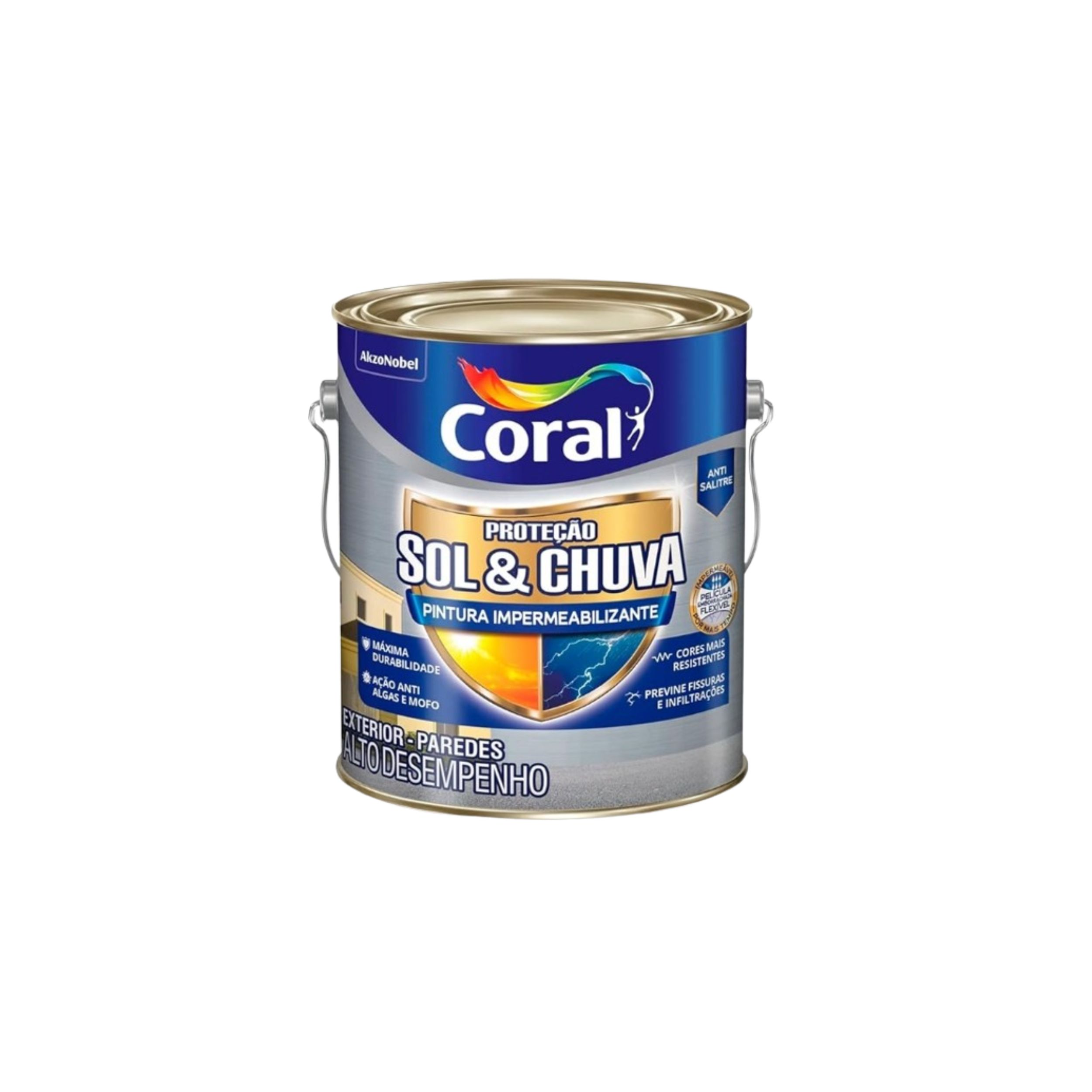 Proteção Sol & Chuva Pintura Impermeabilizante é a opção mais completa para pintar e proteger paredes externas, pois forma uma película emborrachada flexível que previne fissuras e infiltrações, combate algas & mofo, além de conferir máxima durabilidade e resistência a suas cores, que são mais resistentes. É formulado para ser aplicado diretamente em paredes novas ou reboco, pois bloqueia o aparecimento do salitre, permitindo que a pintura seja realizada quando a superfície estiver visivelmente seca, sem a necessidade de esperar o tempo de cura ou aplicar fundos Rende até 85m² acabados por embalagem de 18L.